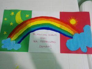 “Andrà tutto bene. Ti vogliamo bene Italia” è la scritta che campeggia sulle magliette, sugli striscioni e sui disegni realizzati dai ragazzi dove sono stati raffigurati tanti arcobaleni e dipinti i colori verde, bianco e rosso della bandiera italiana. Immagini che si alternano sullo schermo accompagnate dalla voce fuori campo di un’educatrice del progetto, Carlotta, che recita la poesia “Un giorno”, scritta da lei interpretando le sensazioni e le emozioni dei ragazzi.
