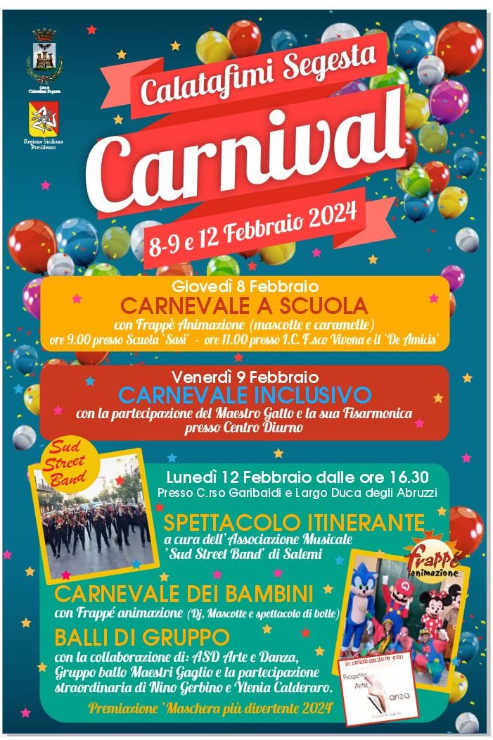 Calatafimi Segesta festeggia il suo Carnevale 2024.Grazie al finanziamento ottenuto dalla Presidenza della Regione Siciliana su proposta dell'assessore Piera Prosa viene proposto il CALATAFIMI SEGESTA CARNIVAL 2024. Verrà festeggiato a SCUOLA (Giovedì 8 dalle 09 al Plesso Sasi e dalle 11 al Vivona in palestra), con l'animazione offerta dal comune ; al Centro DIURNO (Venerdì 9) con un pomeriggio inclusivo insieme a diverse associazioni coinvolte; e poi (LUNEDÌ 12) tutti in strada nel centro storico per un intenso pomeriggio e una divertente serata di coinvolgimento, dal più piccolo al più grande.