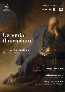 Debutta questa sera alle ore 21 – all’ex Collegio dei Gesuiti di Mazara del Vallo la pièce teatrale “Geremia: il tormento”, messa in scena dagli allievi del corso per lettori (giunto al suo secondo anno) organizzato durante l’inverno trascorso dall’Ufficio diocesano liturgico, con la guida del regista Salvino Martinciglio.