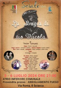 Primo appuntamento col teatro. Apre la compagnia “Scialò”. Sul palcoscenico dell’atrio inferiore del Comune rappresenterà la commedia La bugia di zio Nicola, scritta e diretta da Tonino Genuardi. Inizio dello spettacolo alle ore 21. In scena Tonino Genuardi, Marica Ribaudo, Maria Luisa Santangelo, Fabio Venezia, Francesca Cirafisi, Daniela Venezia, Carmelo La Greca, Vissia Di Leo, Giuseppe Chiarello. Lo spettacolo sarà replicato domani sera.