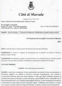 Il Presidente accantona temporaneamente l’atto deliberativo. PUNTO 44 – ATTO D’INDIRIZZO: PROTOCOLLO D’INTESA PER L’AFFIDAMENTO DI SPAZI AREE A VERDE Il Consigliere Calogero Ferreri illustra l’atto deliberativo che si allega in copia. Il Presidente Sturiano rappresenta che il regolamento per l’affidamento degli spazi a verde è stato poco pubblicizzato. Il consigliere Antonio Vinci lamenta che un suo intervento su un’aiuola in piazza a Strasatti ha scatenato l’ira di qualche consigliere e ciò malgrado fosse stato fatto in piena regola e alla presenza dell’Assessore Passalacqua.