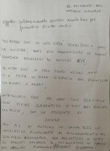 Il Presidente Enzo Sturiano comunica all’aula di una manifestazione indetta per fermare l’emigrazione dei giovani siciliani verso il nord. Dà lettura del documento. E preannuncia un incontro che si terrà venerdì prossimo 6 dicembre proprio a Sala delle Lapidi. Il consigliere Daniele Nuccio si dichiara d’accordo e comunica che ciò va in direzione di quanto stabilito dal Consiglio comunale stesso. Il Presidente Enzo Sturiano solleva il problema della chiusura per domenica prossima dello Stadio Municipale.