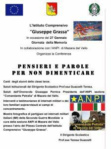 Il 27 gennaio, data dell’abbattimento dei cancelli di Auschwitz, ricorre il “Giorno della Memoria in ricordo dello sterminio e delle persecuzioni del popolo ebraico e dei deportati militari e politici italiani nei campi nazisti”, istituito dal Parlamento italiano, con la legge n. 211 del 2000. La Sezione A.N.P.I. “Comandante Petralia” di Mazara del Vallo e l’Istituto Comprensivo “Giuseppe Grassa” di Mazara di Vallo organizzano la Conferenza “Pensieri e parole per non dimenticare” che si terrà lunedì 27 gennaio 2020 presso: · l’Aula Magna del Plesso Centrale di via Luigi Vaccara, dalle ore 09:00 alle ore 11:00 · l’Auditorium del Plesso di via G.