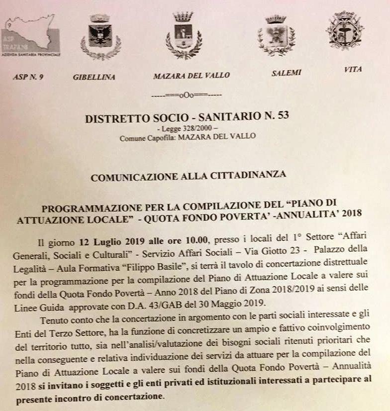 Venerdì 12 luglio alle ore 10 si svolgerà il tavolo di concertazione del Distretto socio-sanitario n. 53 per la compilazione del Piano di attuazione locale relativo alla quota “Fondo Povertà”. All’incontro, che si svolgerà nell’Aula formativa “Filippo Basile” del Palazzo della Legalità di via Giotto sono invitati a partecipare i soggetti e gli enti privati ed istituzionali interessati ad essere coinvolti nella programmazione. Avviso in allegato.