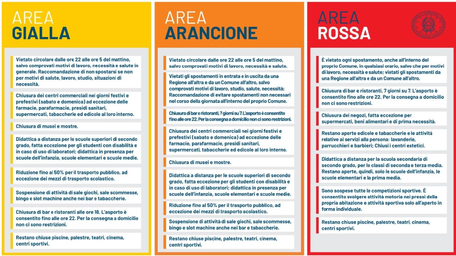 A tal proposito, anche i mezzi pubblici ridurranno al 50% la capacità di posti nei trasporti su gomma, rotaia e marittimi. Sospese le attività dei servizi di ristorazione (fra cui bar, pub, ristoranti, gelaterie, pasticcerie) mentre rimangono consentite la sola ristorazione con consegna a domicilio e quella da asporto fino alle ore 22.00 con divieto di consumazione sul posto o nelle adiacenze. Sospese le attività di didattica in presenza, con la reintroduzione PER LE SOLE scuole superiori, della didattica a distanza (DAD) Allo stesso modo, nelle giornate festive e prefestive sono chiuse le medie e grandi strutture di vendita, nonché gli esercizi commerciali presenti all'interno dei centri commerciali e dei mercati, ad eccezione di farmacie, parafarmacie presidi sanitari, punti vendita di generi alimentari, tabacchi ed edicole.
