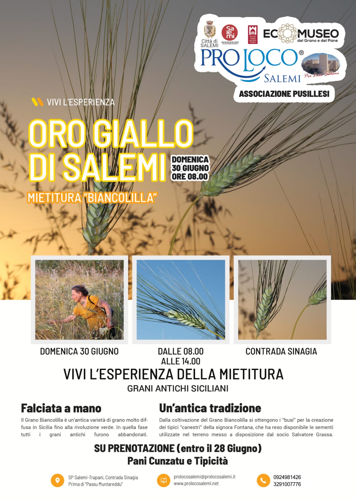 Si terrà a Salemi il 30 Giugno 2019 in Contrada Sinagia, prima di Passu Muntareddu, la manifestazione “Oro Giallo di Salemi”: una giornata dedicata all’antica tradizione della falciatura a mano del grano “Biancolilla”, un’antichissima varietà di grano molto diffusa in Sicilia fino ai primi decenni del ‘900 e abbandonata a seguito della così detta “rivoluzione verde”. Dalla coltivazione di questa varietà di grano si ottenevano i busi con i quali venivano realizzati i canestri tipici della tradizione contadina e che oggi rappresentano un importante testimonianza storica di un’epoca ormai lontana, ma che fa parte della cultura e del modus vivendi di un popolo.