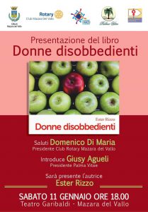 Sabato 11 gennaio alle ore 18 al teatro Garibaldi si terrà la presentazione del libro "Donne disobbedienti" di Ester Rizzo. L'evento, patrocinato dal Comune di Mazara del Vallo, è organizzato dal Rotary Club Mazara, in collaborazione con le Associazioni "Palma Vitae"e Toponomastica Femminile. L’incontro con l’Autrice, dopo i saluti del presidente del Rotary Club Mazara, Domenico Di Maria, sarà introdotto dalla presidente di “Palma Vitae”, Giusy Agueli. “Ester Rizzo, scrittrice impegnata nell'ambito delle tematiche femminili – sottolineano gli organizzatori dell’evento culturale - torna alle stampe riunendo in questo lavoro di ricerca alcune tra le figure che si sono distinte per la loro disobbedienza.