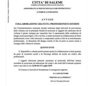 “A nessun lavoratore può essere chiesto di operare gratuitamente, ma pare che la pubblica amministrazione voglia dimenticarlo”. Queste le parole dell’ordine professionale degli assistenti sociali della regione dopo avere visionato l’avviso pubblicato dal Comune di Salemi in cui si cercano professionisti esterni (assistenti sociali e psicologi) “qualificati” che possano lavorare gratis. “E’ surreale – spiega l’Ordine – che un Comune che si pone, giustamente, il problema di realizzare degli interventi di ‘prevenzione della violenza con la principale finalità di assicurare ai soggetti che subiscono atti di violenza il giusto sostegno per consentire loro il superamento della condizione di disagio socio-psicologico’ scambi dei liberi professionisti per dei volontari.
