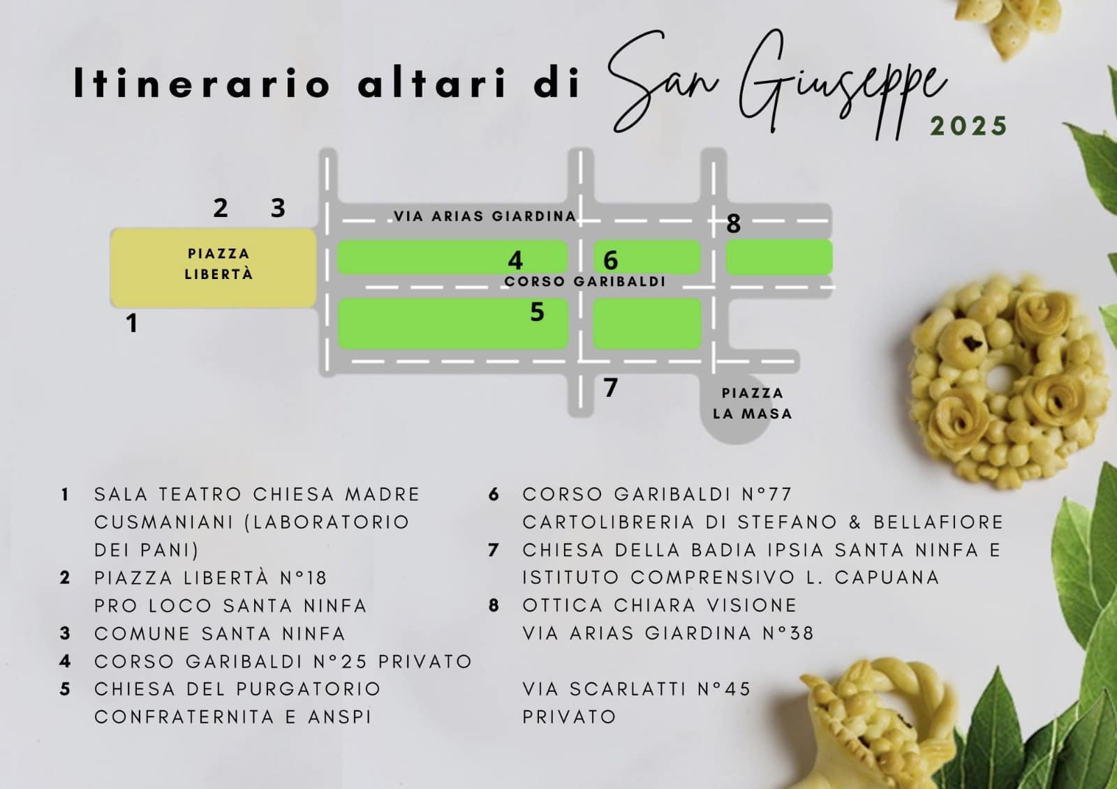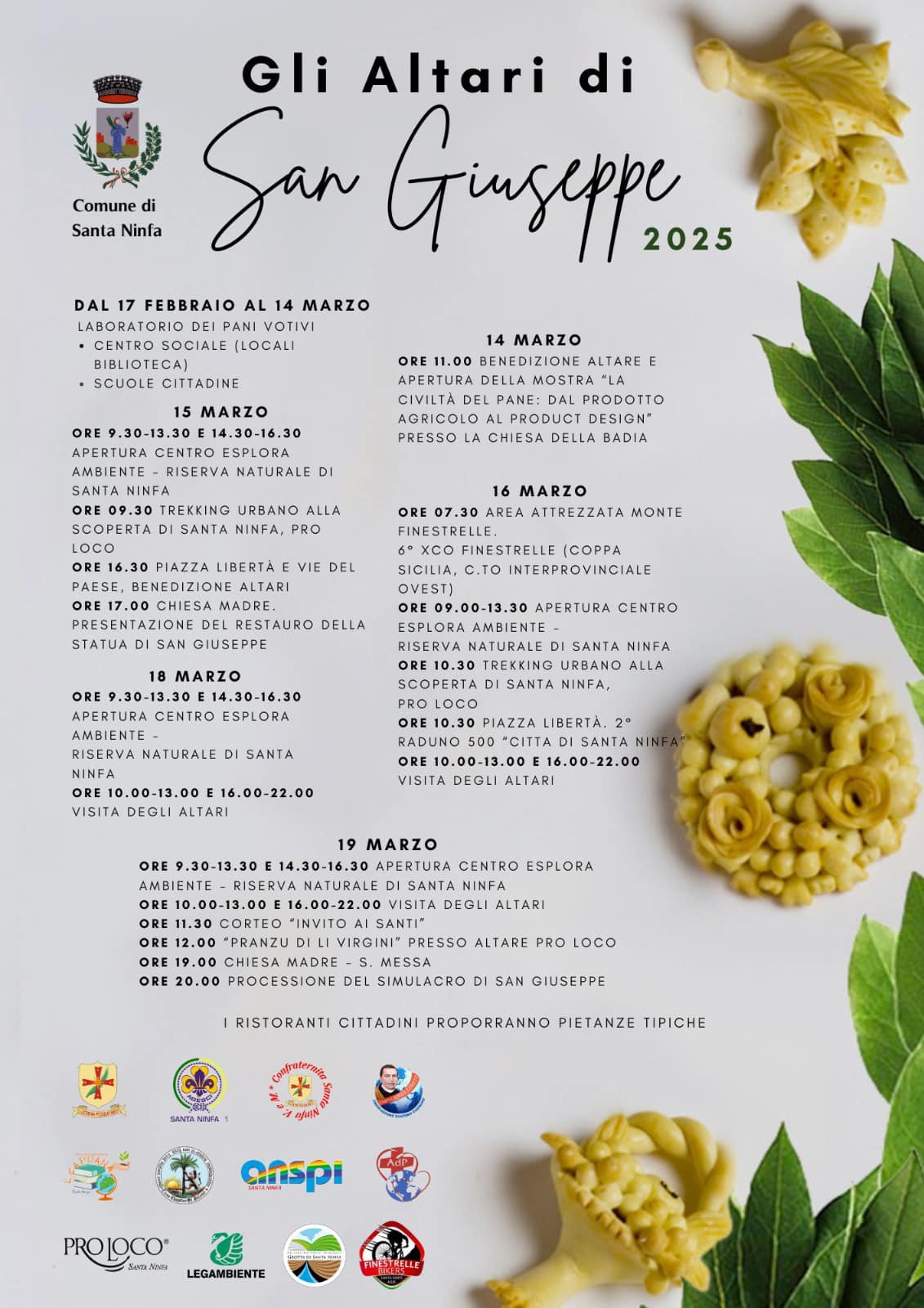 Dal 14 al 19 Marzo 2025 torna a Santa Ninfa la Festa di San Giuseppe. Anche quest'anno l’Amministrazione comunale ha voluto coinvolgere le diverse realtà sociali santaninfesi, unite dalla devozione verso il Santo compatrono, con l’obiettivo di riscoprire e valorizzare una delle più antiche tradizioni della nostra città.Una tradizione che, quest’anno, presenta un itinerario di otto altari votivi lungo le vie del centro storico e uno nel nuovo centro (Via Scarlatti n. 45), allestiti grazie alle sapienti e laboriose mani santaninfesi. Di seguito la locandina con il programma degli eventi.