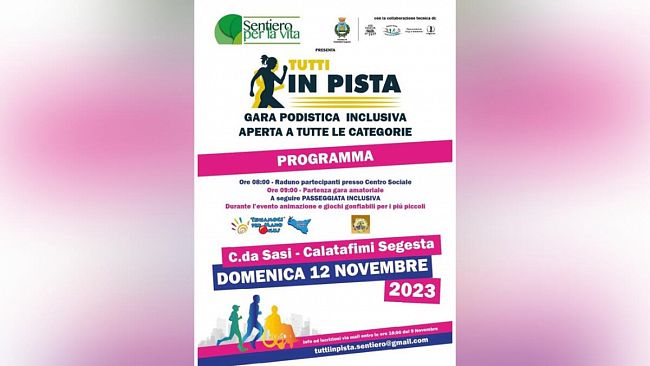 A seguire si svolgerà una "passeggiata inclusiva" aperta a tutti.L'iniziativa non dimentica i più piccoli per i quali sono previste attività di animazione con i clown dell'associazione "Teniamoci per mano" e un'esibizione di aquiloni a cura del patron del Festival degli Aquiloni di San Vito Lo Capo Ignazio Billera.Collaborano all'organizzazione della manifestazione l'Associazione per il Dopo di Noi, l'A.S.C.D. Number One, l'A.S.D. Segesta e l'Associazione Nazionale Volontariato Giovanile Onlus.Informazioni e iscrizioni (entro il 9 novembre) alla mail: tuttiinpista.sentiero@gmail.