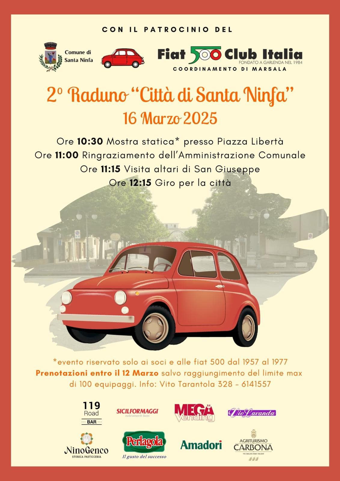 Il Comune di Santa Ninfa, con il patrocinio del Fiat 500 Club Italia - Coordinamento di Marsala, è lieto di annunciare la seconda edizione del raduno "Città di Santa Ninfa", in programma per il 16 marzo 2025. L'evento promette di essere una giornata all'insegna della passione per l'iconica vettura italiana. Il raduno avrà inizio alle ore 10:30 con una mostra statica delle auto in Piazza Libertà, dove gli appassionati potranno ammirare da vicino i modelli storici e scambiare opinioni con altri soci del club.